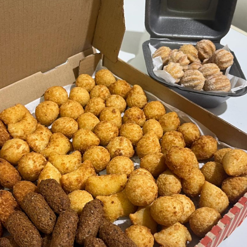 50 salgadinhos fritos, sequinhos e super crocantes, empanados na farinha panko, com massa leve e recheios saborosos. Acompanha 10 mini churros recheados com doce de leite, douradinhos e irresistíveis, perfeito pra quem não resiste a um docinho!!