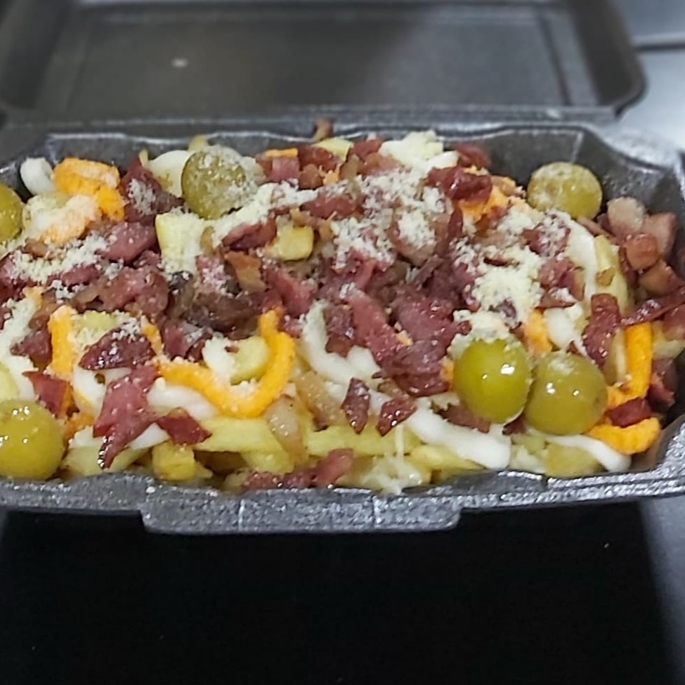 (Batata maluca)acompanha mussarela,Catupiry ,cheddar,calabresa,bacon,azeitona é queijo parmesão, é muita delícia em um só prato