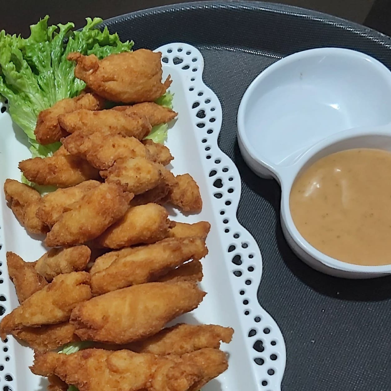 Isca de filé de peito de frango muito bem temperado ,acompanha um maravilhoso molho rose