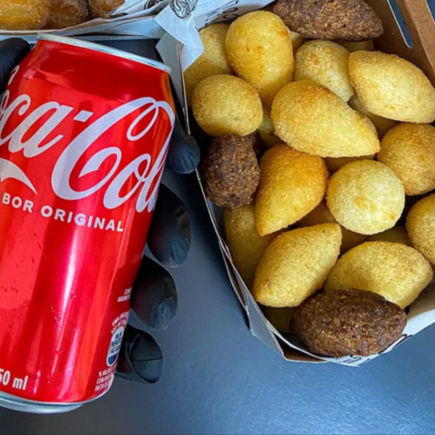 30 salgadinhos crocantes + Coca-Cola 350ml gelada. Perfeito pra matar a fome gastando pouco!