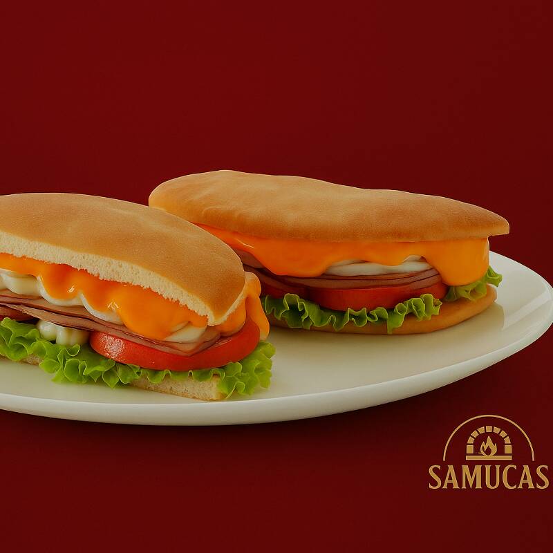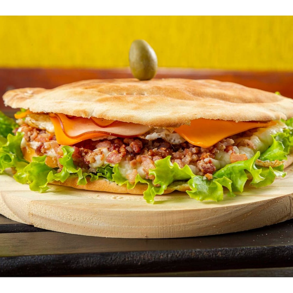 Pão tipo sírio, alface, maionese, molho especial, Catupiry. Cheddar. tomate, bacon, peito de peru, ovo frito