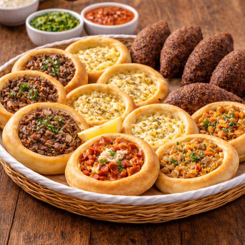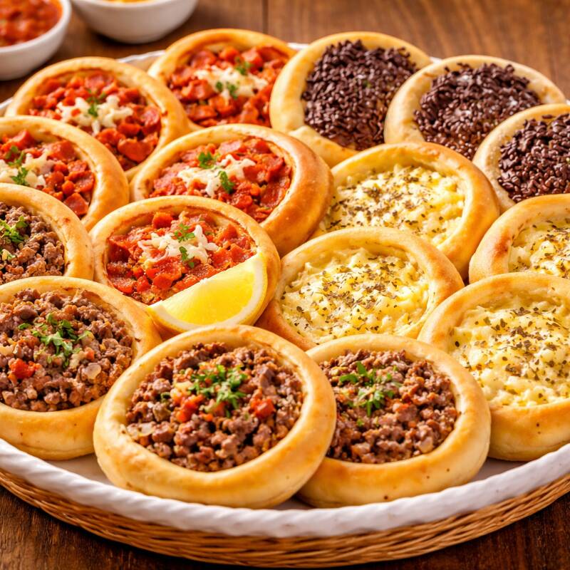 Leve 5 esfihas de carne + 5 esfihas de queijo + 5 esfihas de calabreso + 3 esfihas de chocolate.