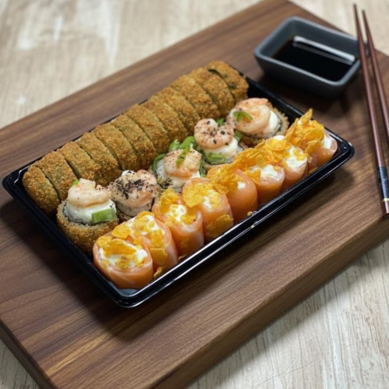 Este prato apetitoso inclui 10 fatias de sashimi, 4 sushis, 4 joe rolls, 10 uramakis e 10 hossomakis, repletos de sabor. Para completar a experiência, incluímos 12 peças de nosso irresistível hot filadélfia.