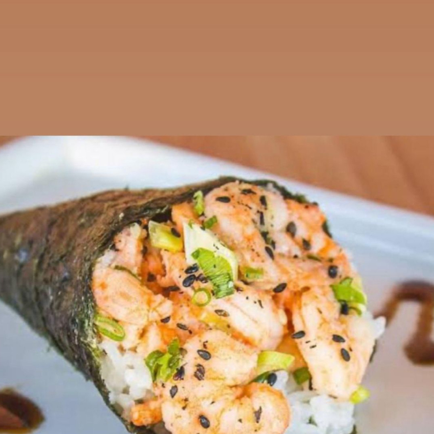 Cone de camarão, nori, arroz, cream cheese e cebolinha.
