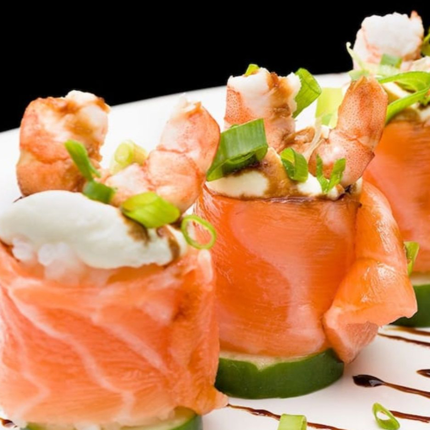 Deliciosa tira de salmão com cream cheese,camarão, gergelim e cebolinha.