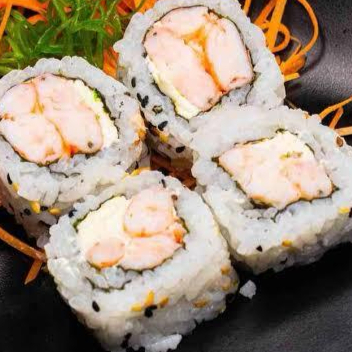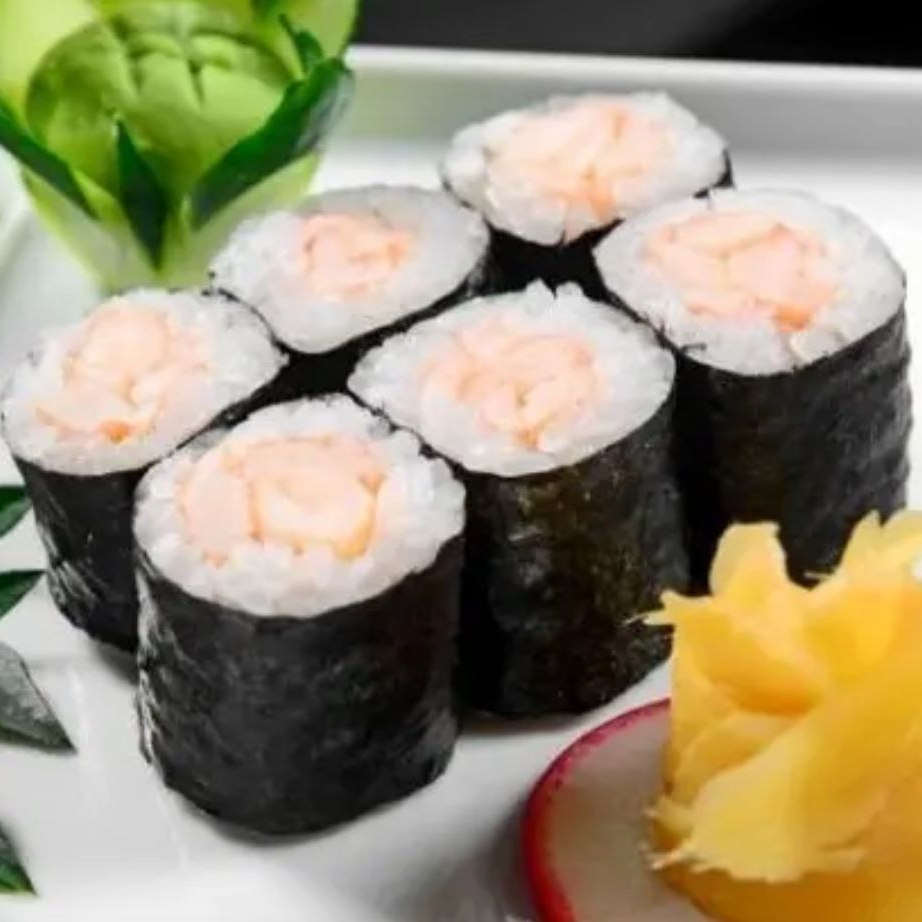 Enrolado de nori, arroz, camarão, cream cheese e cebolinha.