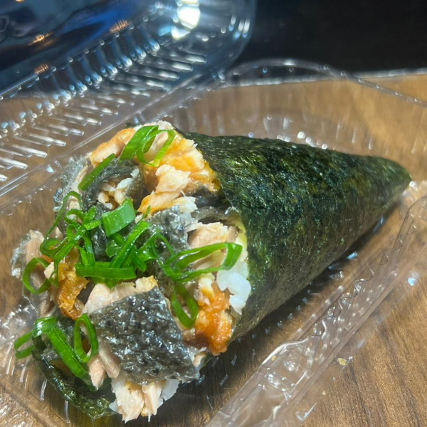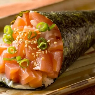 Cone de salmão, nori, arroz, cream cheese e cebolinha.