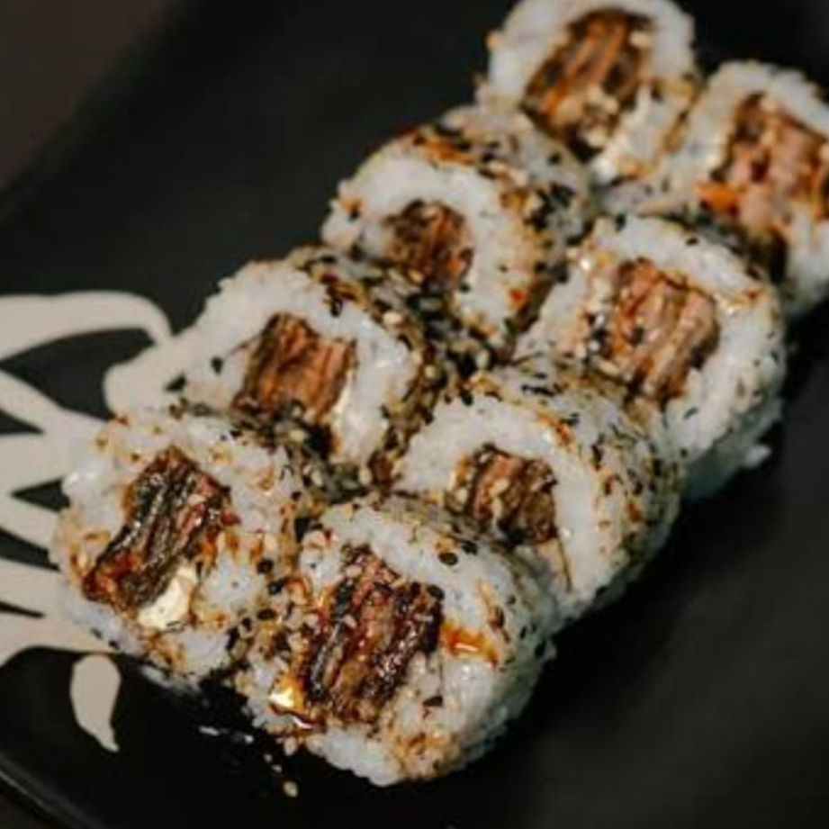Enrolado de nori, arroz, pele de salmão frita, cream cheese e cebolinha.