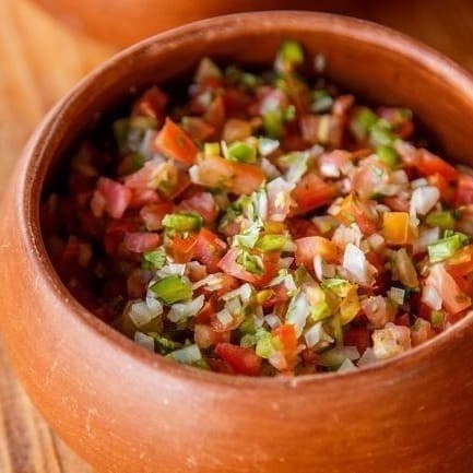Uma deliciosa combinação de tomates frescos, cebolas crocantes e pimentões coloridos, tudo finamente picado e envolto em um molho agridoce de vinagre e azeite de oliva.