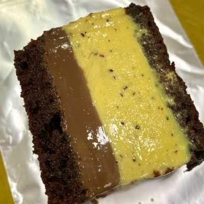 Massa de chocolate molhadinha com recheio cremoso de brigadeiro feito com chocolate nobre e brigadeiro azedinho de maracujá feito com a polpa.