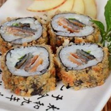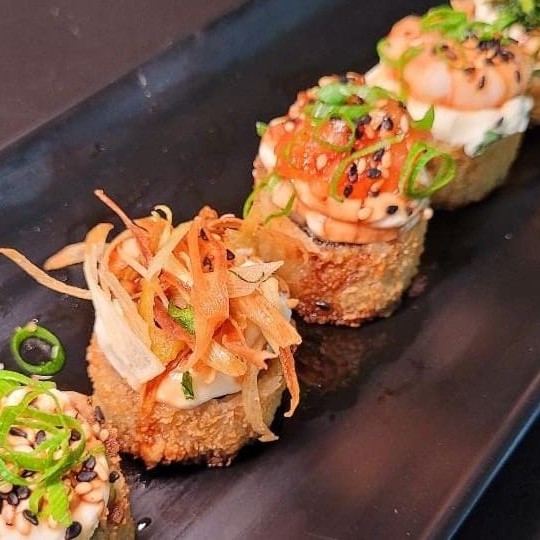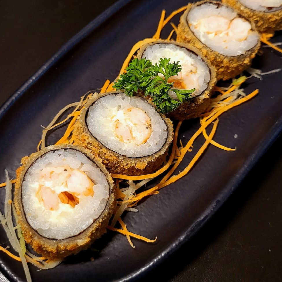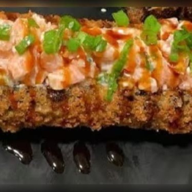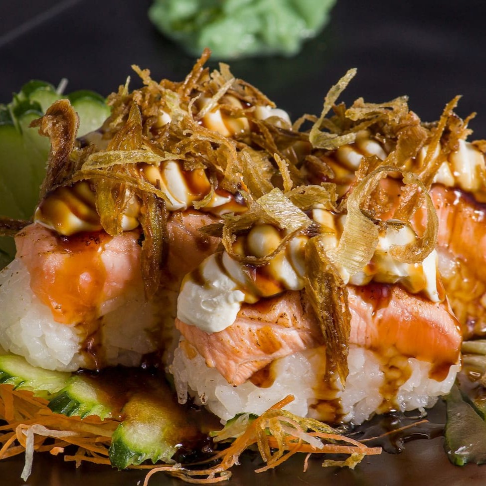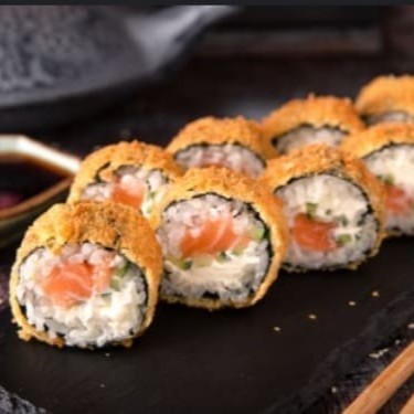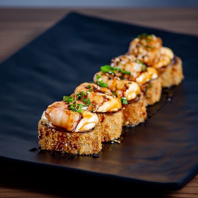 Enrolado de arroz empanado, cream cheese, salmão, camarão empanado, cebolinha, teriaki e gergelim
