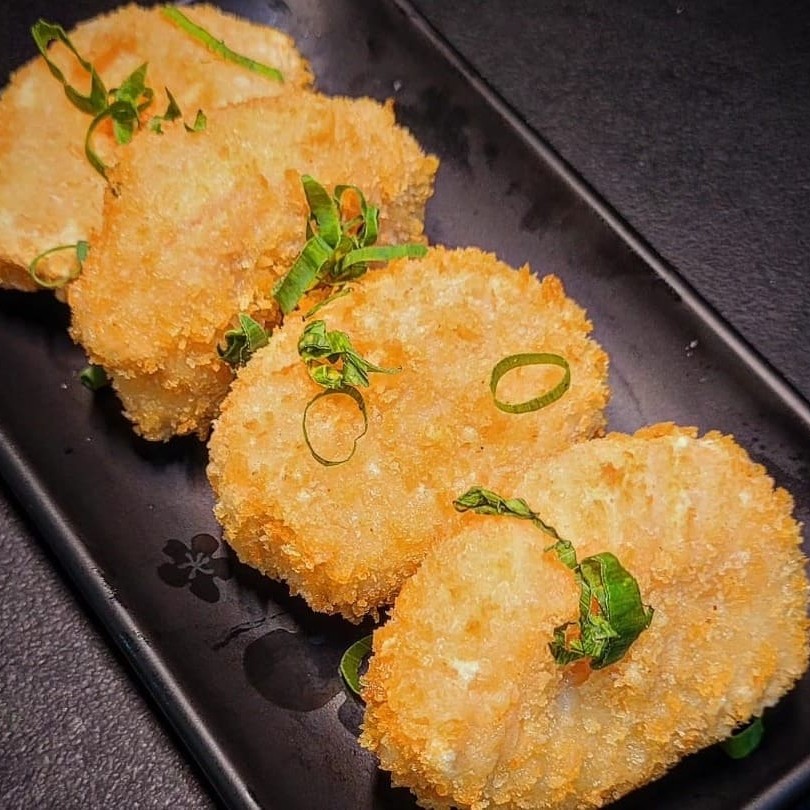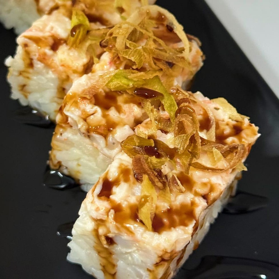 Enrolado de arroz empanado, cream cheese, atum, cebolinha, teriaki e gergelim