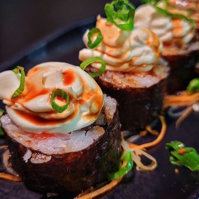 Makimono skin finalizado com cream cheese, teriaki, gergelim e cebolinha.