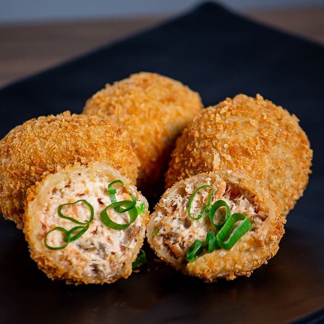 Temaki empanado de arroz, salmão, cream cheese e cebolinha