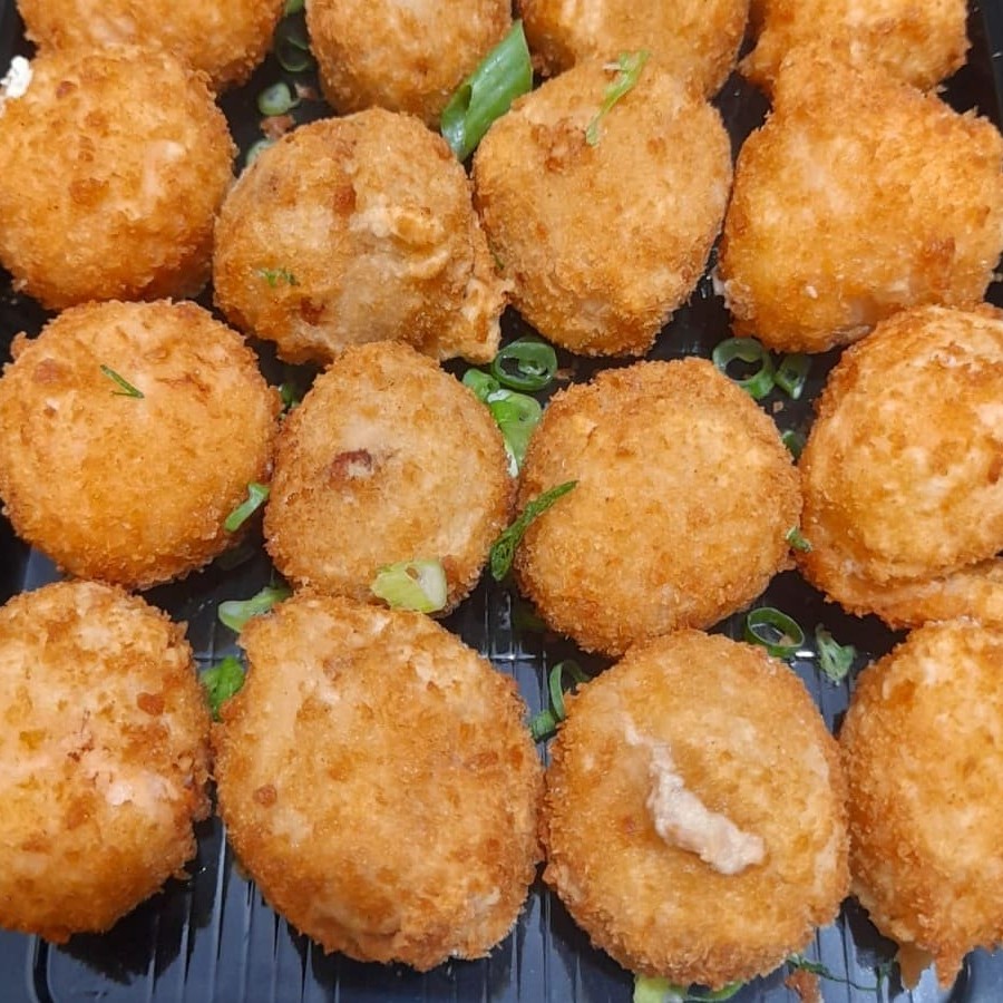 Corte de salmão empanado, recheado com salmão em cubo, cream cheese e cebolinha.