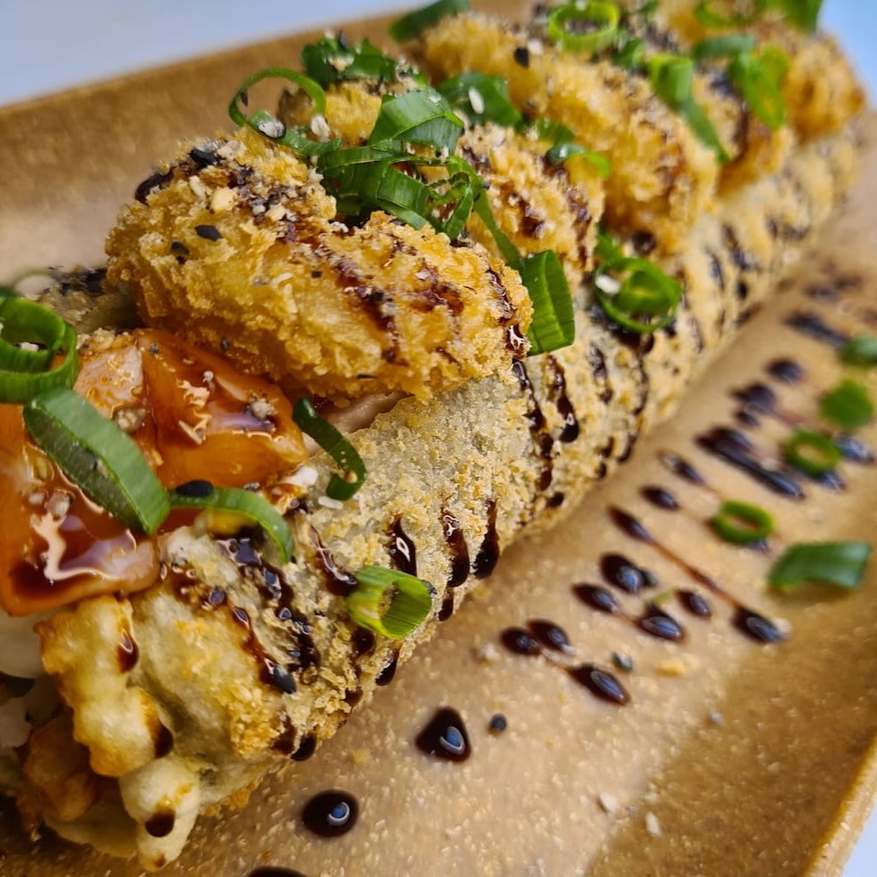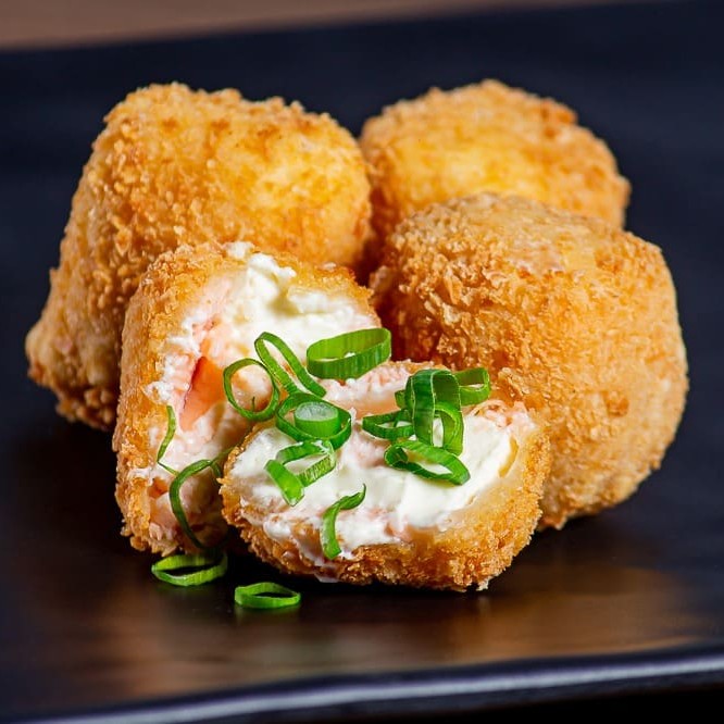 Temaki empanado de arroz, salmão, cream cheese e cebolinha