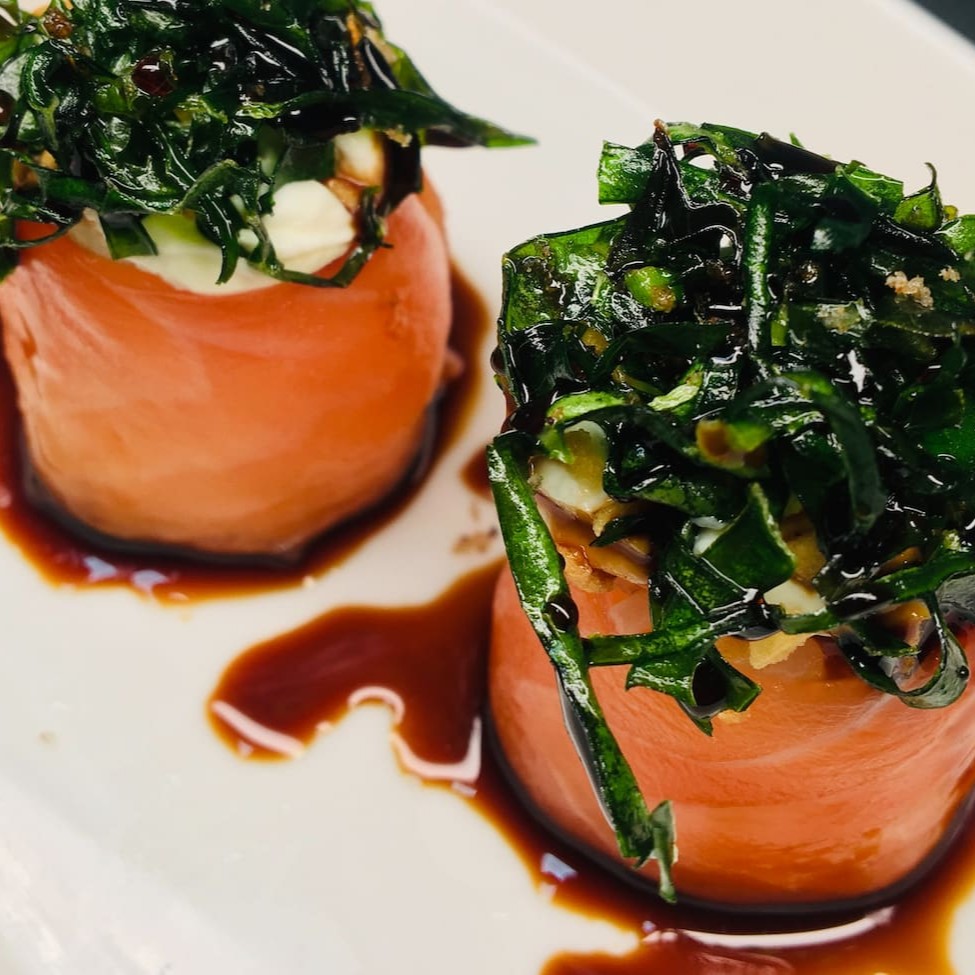 Laminas de salmão fresco finalizadas com um toque refinado de azeite trufado e flor de sal, levemente maçaricado. Uma explosão de sabor que equilibra a untuosidade do peixe com a sofisticação do trufado e o realce delicado da flor de sal.