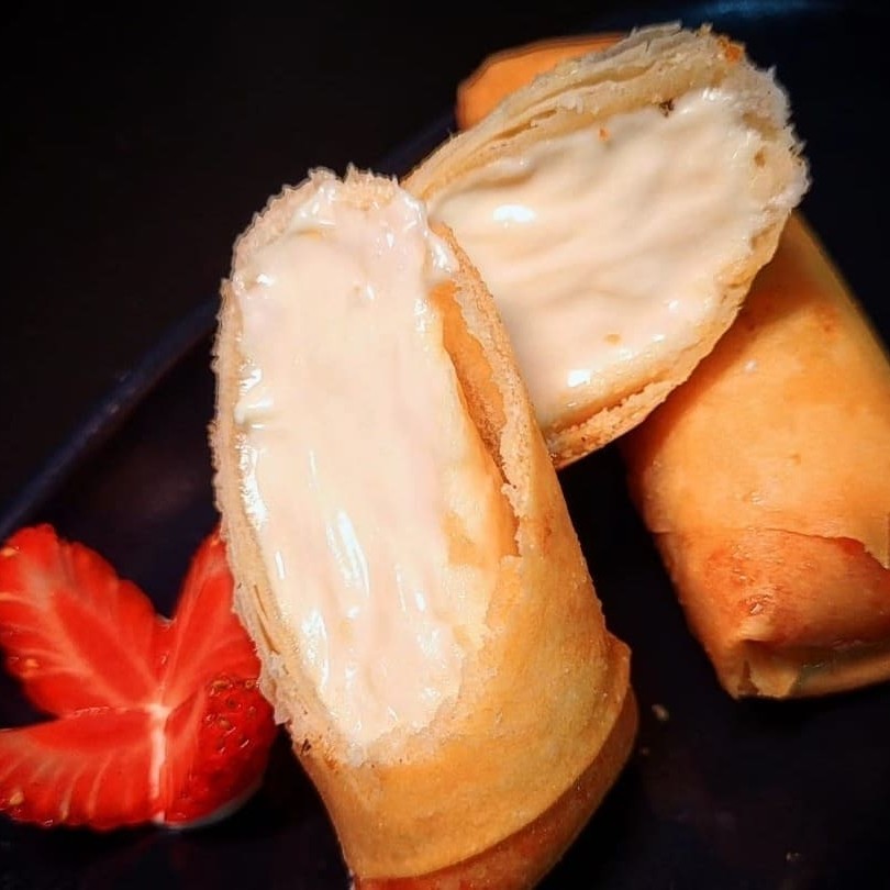 Harumaki recheado com doce de leite e chocolate branco.