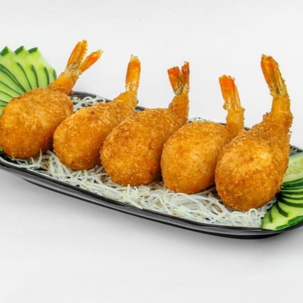 Uma deliciosa porção de camarão empanado na farinha panko e frito.