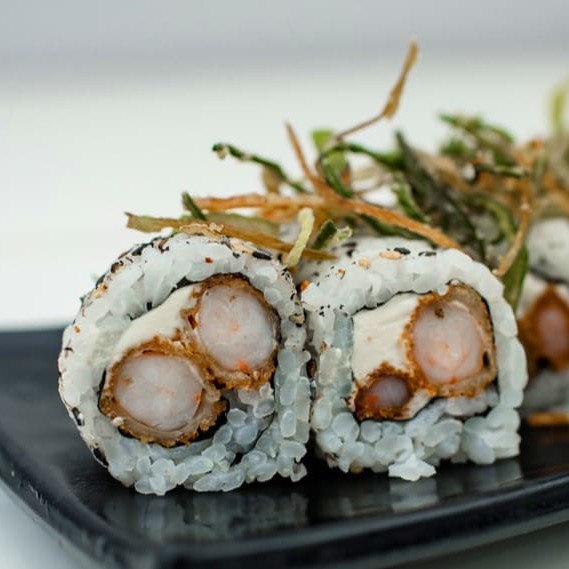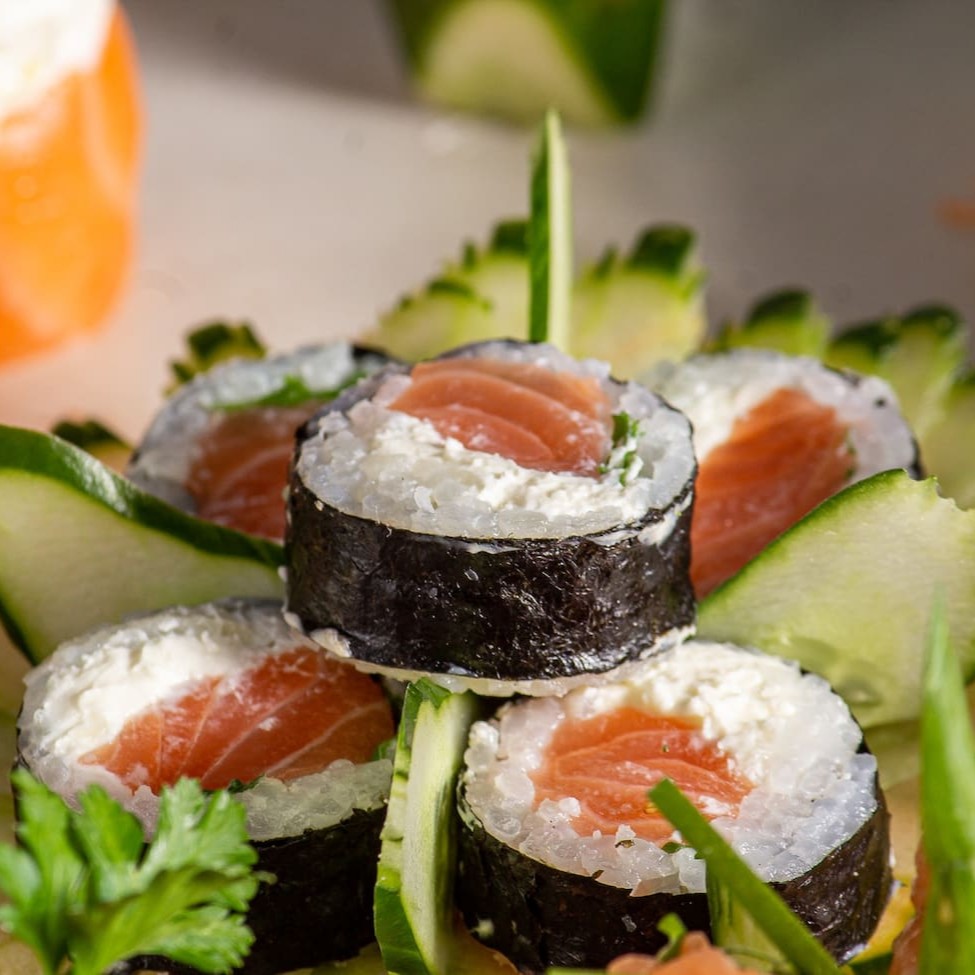 Alga nori, arroz, cream cheese, e salmão.