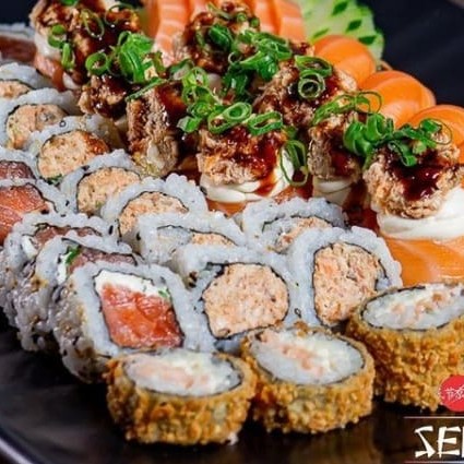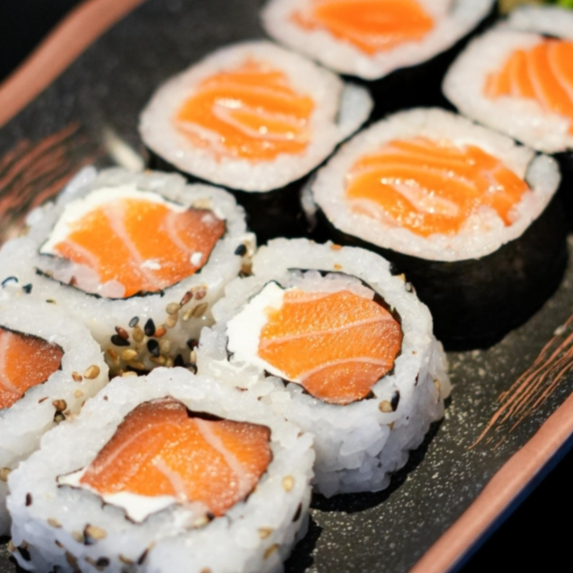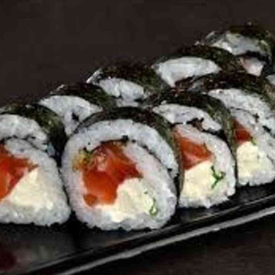 Nori, arroz, salmão, cream cheese, finalizado com cebolinha.