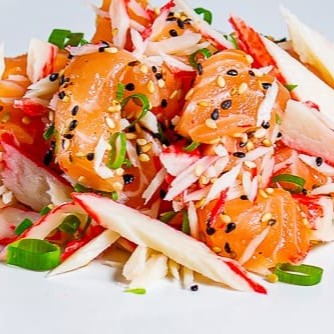 Salmão em cubo com kani finalizado oléo de gergelim, gergelim e cebolinha.
