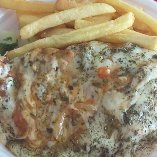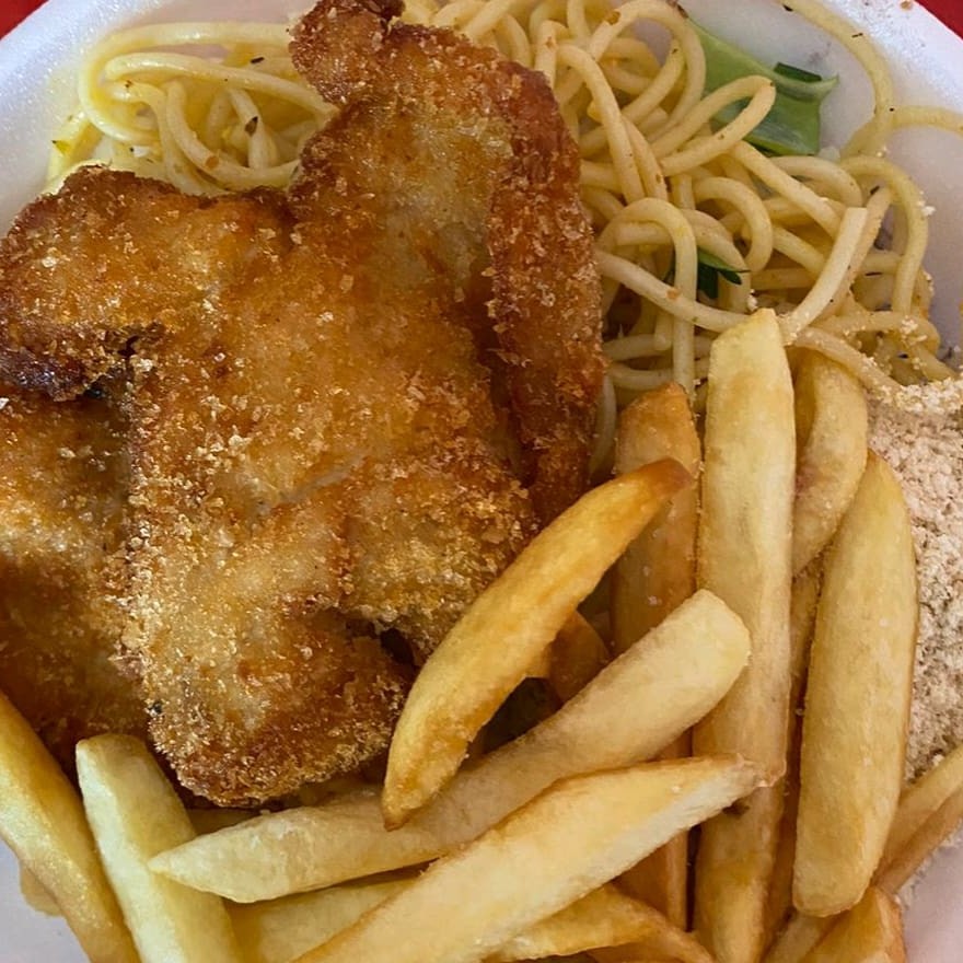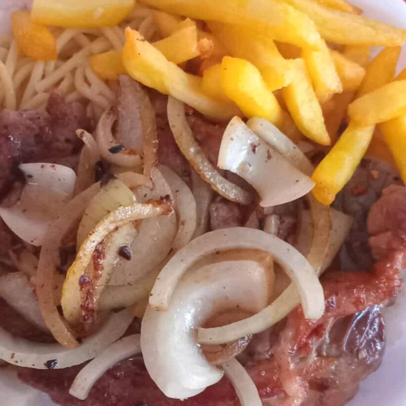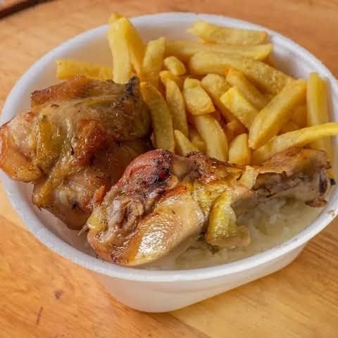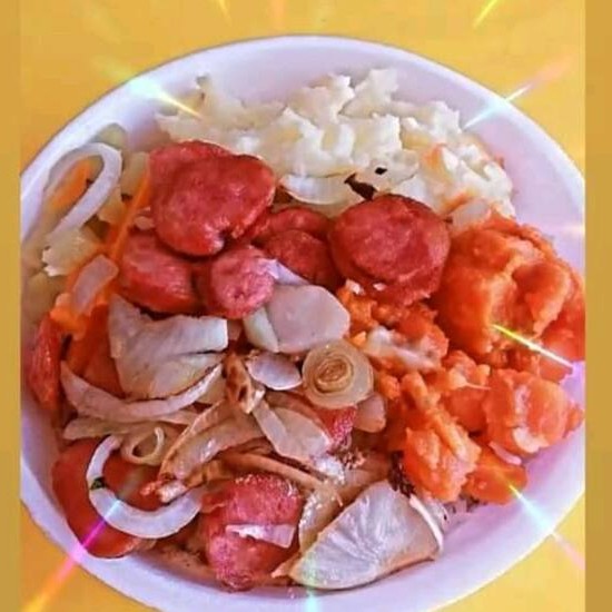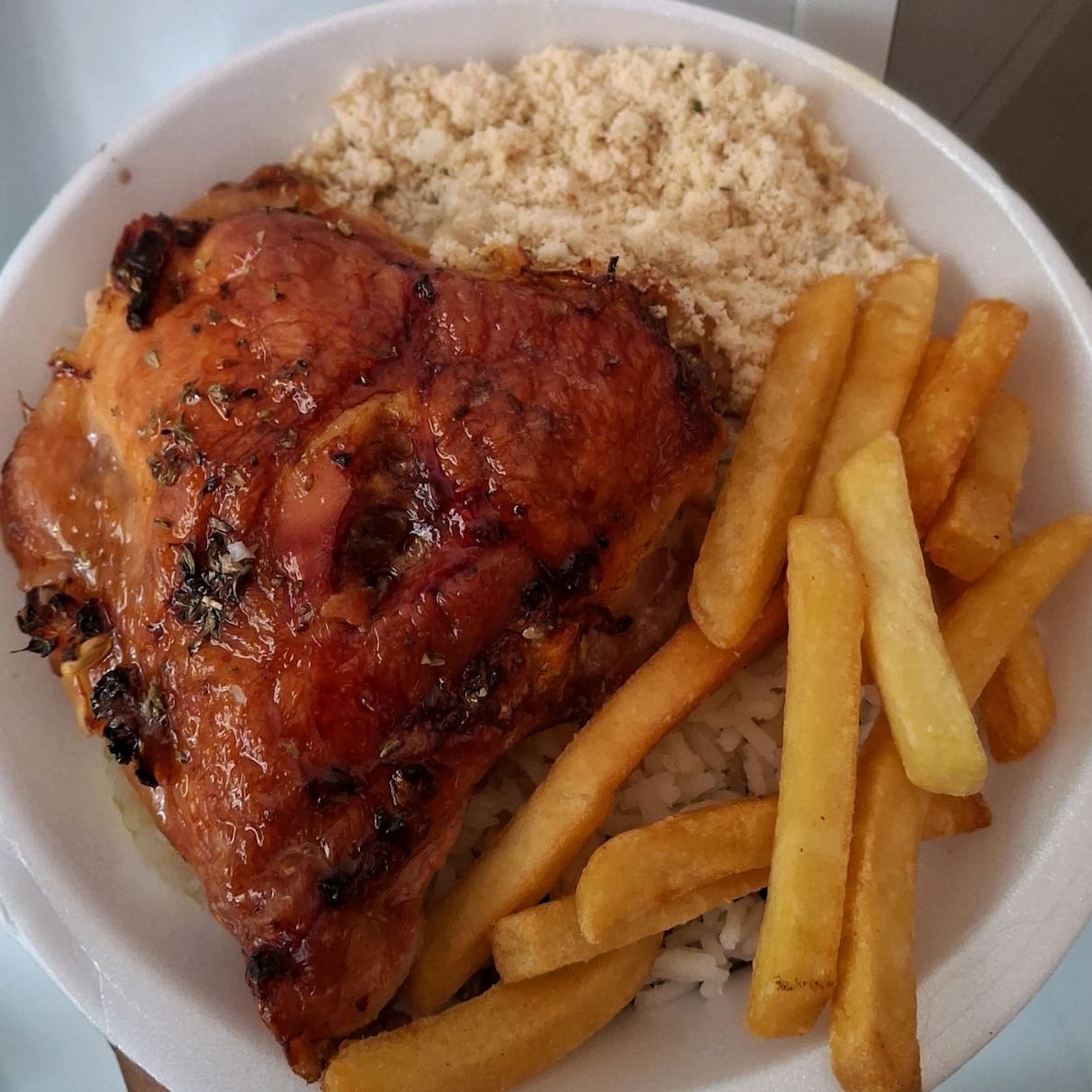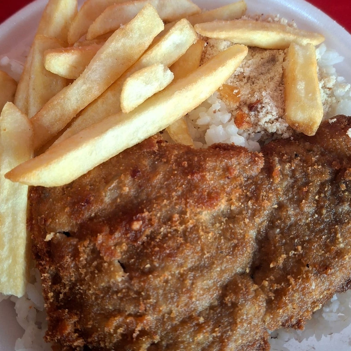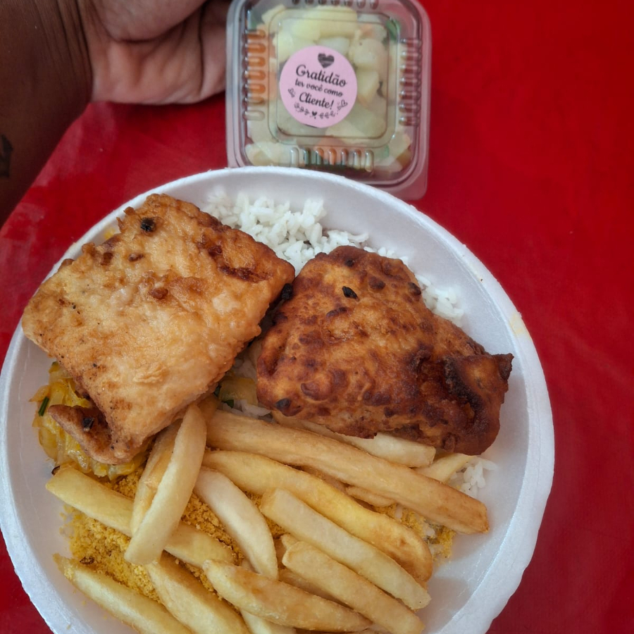 Arroz, feijão, macarrão farofa e fritas ou legumes
