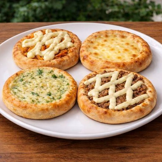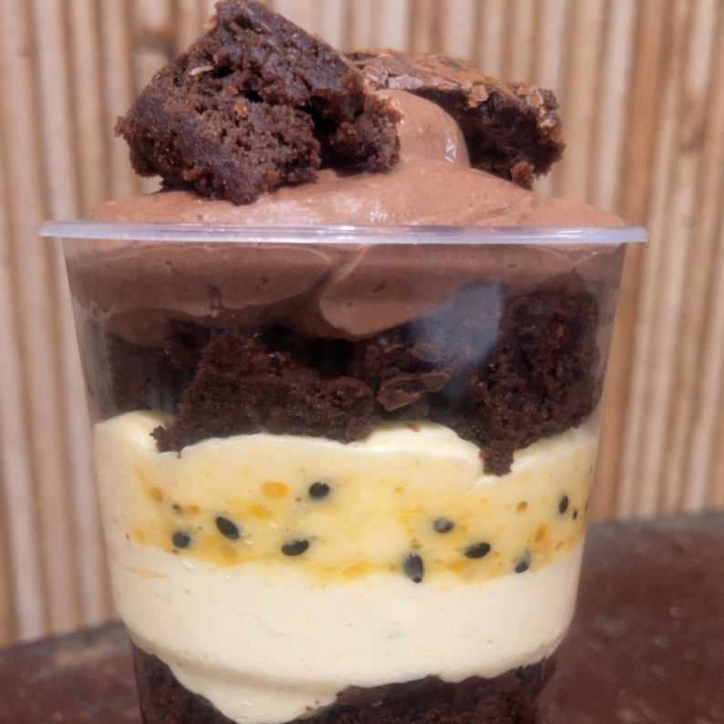 brigadeiro cremoso, brownie, mousse de maracuja e mousse de chocolate.