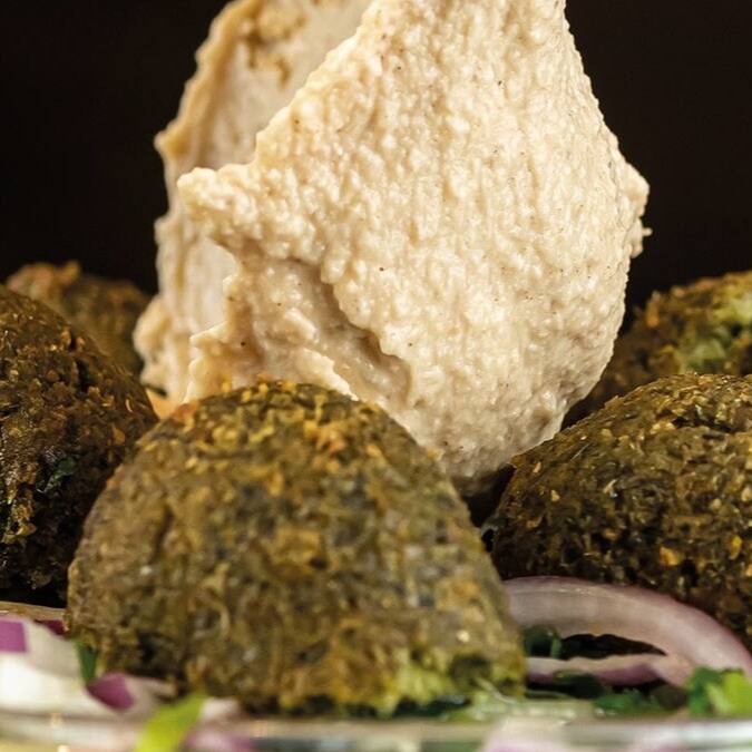 Shawarma Sabich Falafel. O clássico sanduba israelense com extra do nosso falafelverdinho - berinjela grelhada, bolinhos de grãode bico (Falafel), molho amba (a base de manga, curry eespeciarias), salat israeli (tomates e pepinos em cubos) hummus , servido na pita artesanal.