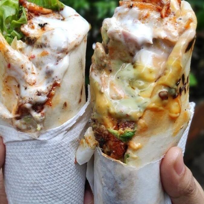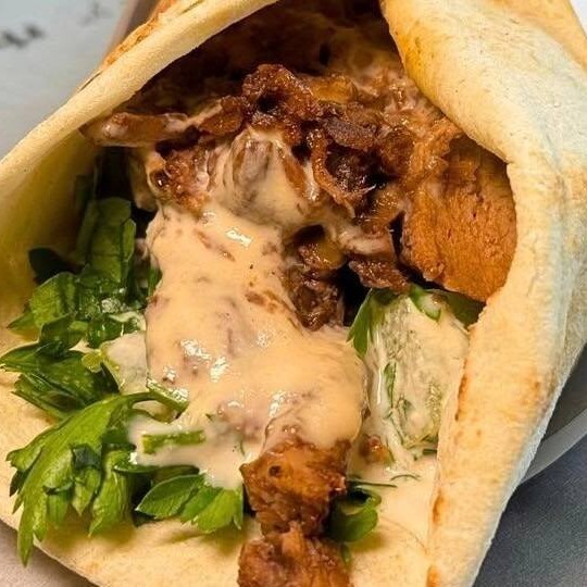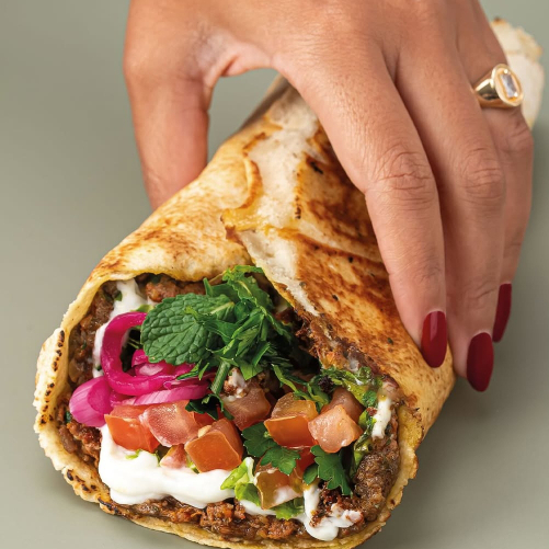 Shawarma Smash de kafta com creme toum ( creme de alho árabe ) com hortelã, salada Fatuche , servido na pita artesanal.