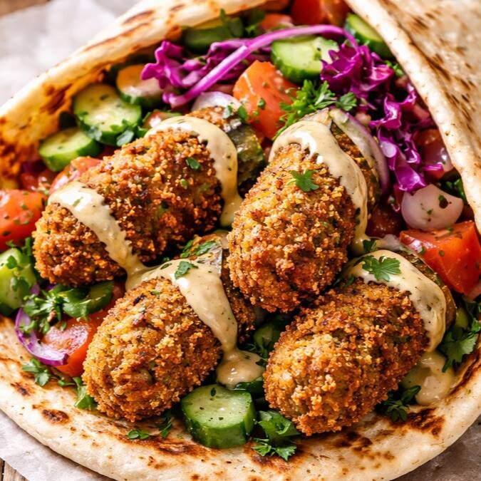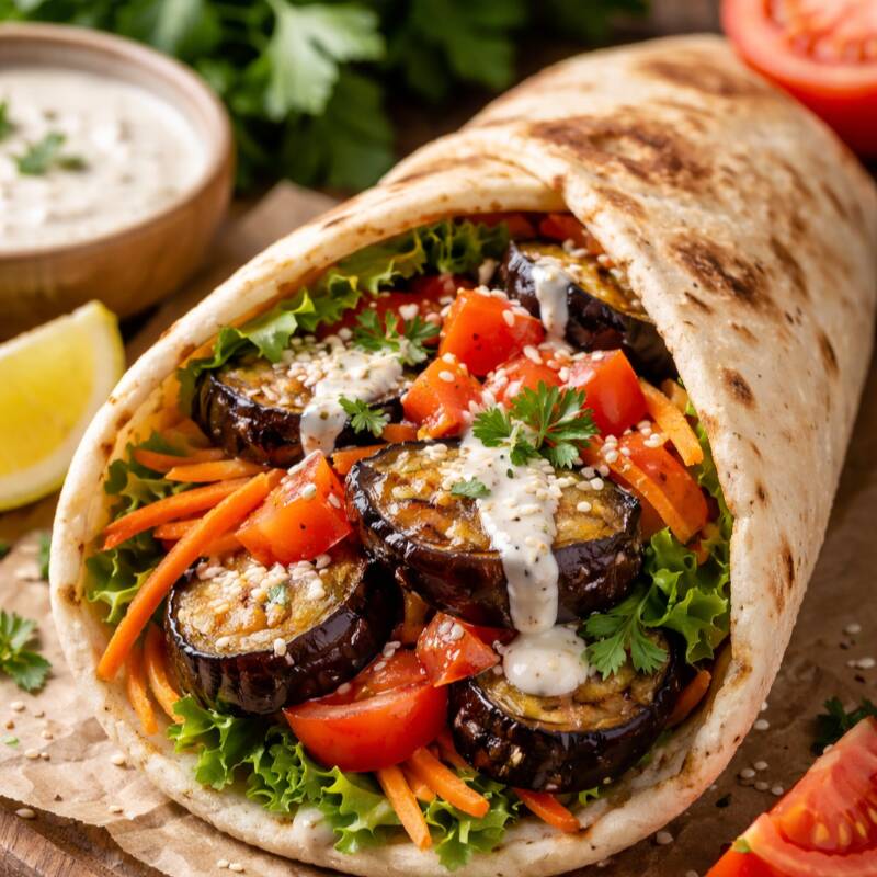 O Croquete de Berinjela é uma opção vegana e saudável que vai surpreender o seu paladar. Feitos à base de Berinjela Defumada e uma mistura especial de temperos, nosso Croquete de Berinjela é crocante por fora , macio e suculento por dentro, como deve ser. Como recheio de nossos Shawarmas, o Croquete de Berinjela é uma excelente opção para deixar o seu prato saboroso e nutritivo. O shawarma de Croquete de Berinjela é montado com um molho de sua preferência, além de Repolho, Tomate, Pepino, Cebola Roxa, Cheiro Verde, Hortelã.