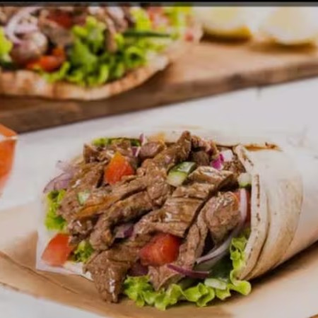 Pão, alface, tomate, cebola roxa, vinagrete, picles, hortelã, pasta humus ou aioli, molho tahine e carne. Lanche completo, muito saudável e servido quentinho para uma pessoa. Muita leveza nessa refeição, cremosidade na pasta a sua escolha e suculência na proteína. **A Combinação Perfeita Do Melhor Sabor.**
