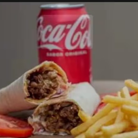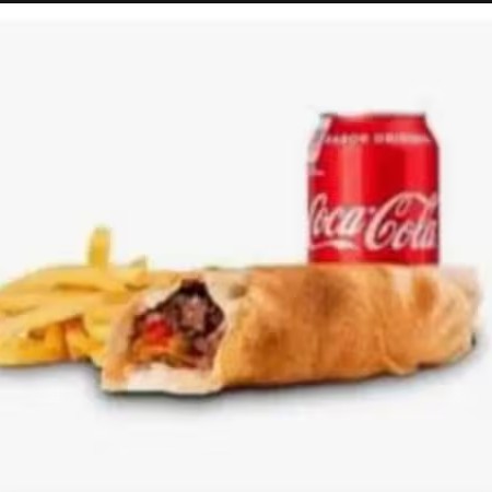 Pão, alface, tomate, cebola roxa, vinagrete, picles, hortelã, pasta humus ou aioli, molho tahine, carne, acompanhado de porção pequena de batata frita e bebida a sua escolha do cardápio. Lanche completo, muito saudável e servido quentinho para uma pessoa. Muita leveza nessa refeição, cremosidade na pasta a sua escolha e suculência na proteína. A combinação mais saborosa que você já experimentou. **A Combinação Perfeita Do Melhor Sabor.**