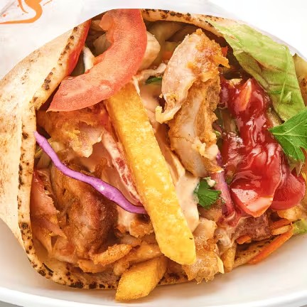 Pão, alface, tomate, cebola roxa, vinagrete, picles, hortelã, pasta humus ou aioli, molho tahine, carne, frango e batata frita dentro do shawarma. Lanche completo, muito saudável e servido quentinho para uma pessoa. Muita leveza nessa refeição, cremosidade na pasta a sua escolha e suculência na proteína com a batata frita palito fininha mais saborosa que você já saboreou. **A Combinação Perfeita Do Melhor Sabor.**