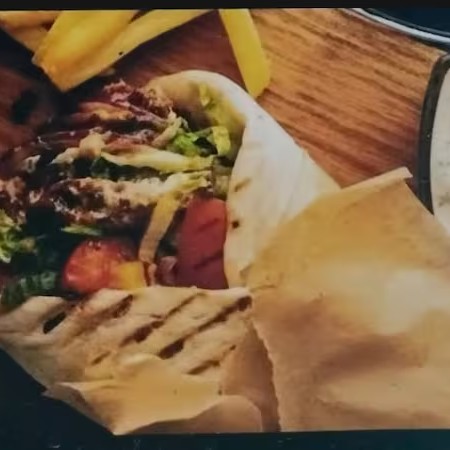 Pão, alface, tomate, cebola roxa, vinagrete, picles, hortelã, pasta humus ou aioli, molho tahine, carne e frango acompanhado de porção pequena de batata frita e bebida a sua escolha do cardápio. Lanche completo, muito saudável e servido quentinho para uma pessoa. Muita leveza nessa refeição, cremosidade na pasta a sua escolha e suculência na proteína. A combinação mais saborosa que você já experimentou. **A Combinação Perfeita Do Melhor Sabor.**