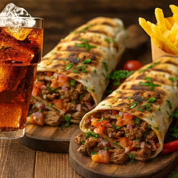 Combo especial para dois: escolha 2 shawarmas (carne, frango ou falafel), acompanhados de 2 porções de fritas, 2 molhos de alho cremosos e 2 Coca-Colas 350ml geladas.