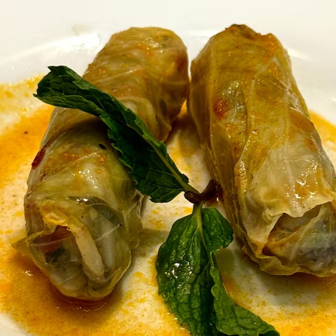 "Tradicional charuto de repolho recheado com carne moída e arroz, temperado com especiarias árabes e cozido lentamente em molho de tomate artesanal. Uma explosão de sabor e tradição no seu prato!"