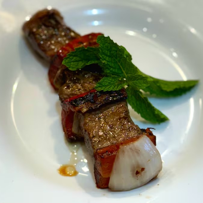 "Delicado filé michui de Filé Mignon temperado com especiarias árabes, assado no espeto para realçar o sabor único e marcante. Uma verdadeira experiência gastronômica do Oriente Médio no seu prato!"
