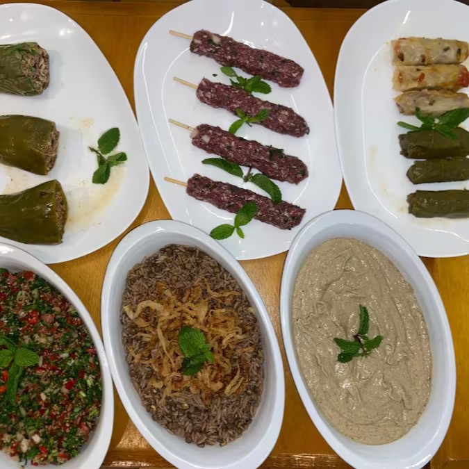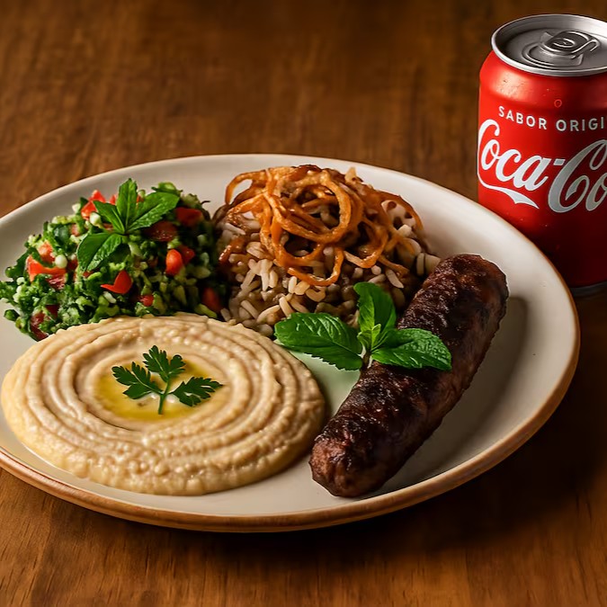 Kafta de Carne temperada e grelhada, acompanhada por tabule refrescante, molho homus cremoso e arroz com lentilhas aromático. Uma combinação irresistível!