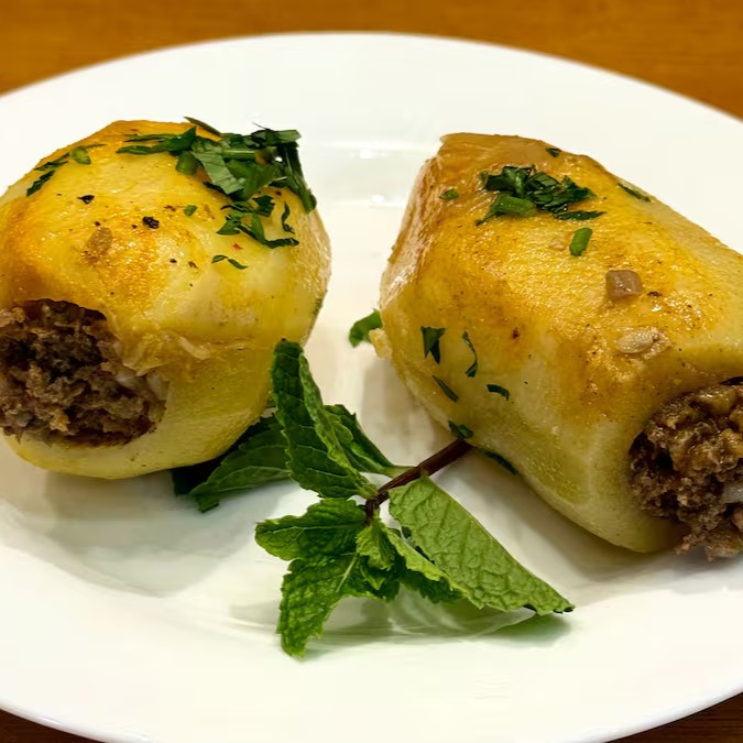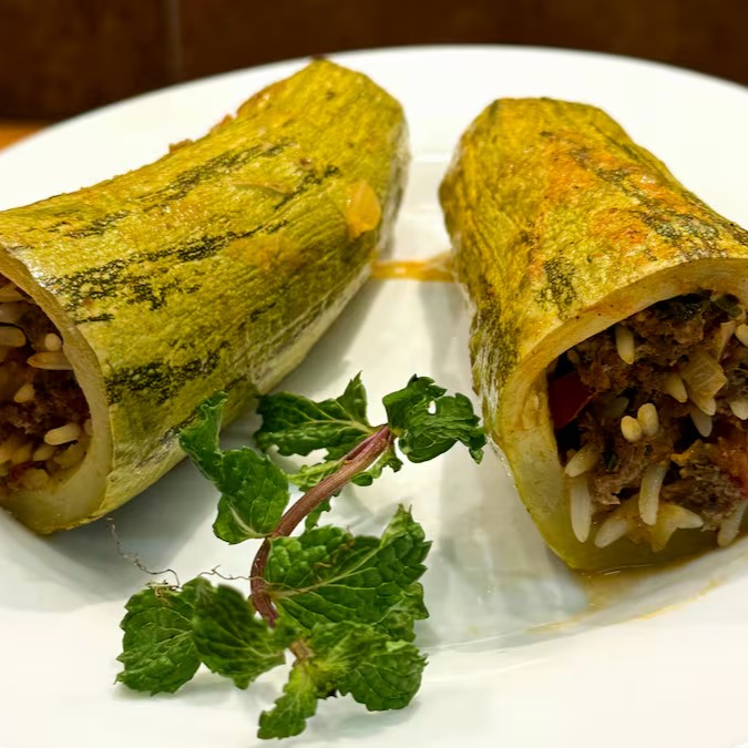 "Deliciosa abobrinha recheada com carne moída e temperos tradicionais, em um molho de tomate artesanal. Um toque saudável e saboroso do Oriente Médio no seu prato!"