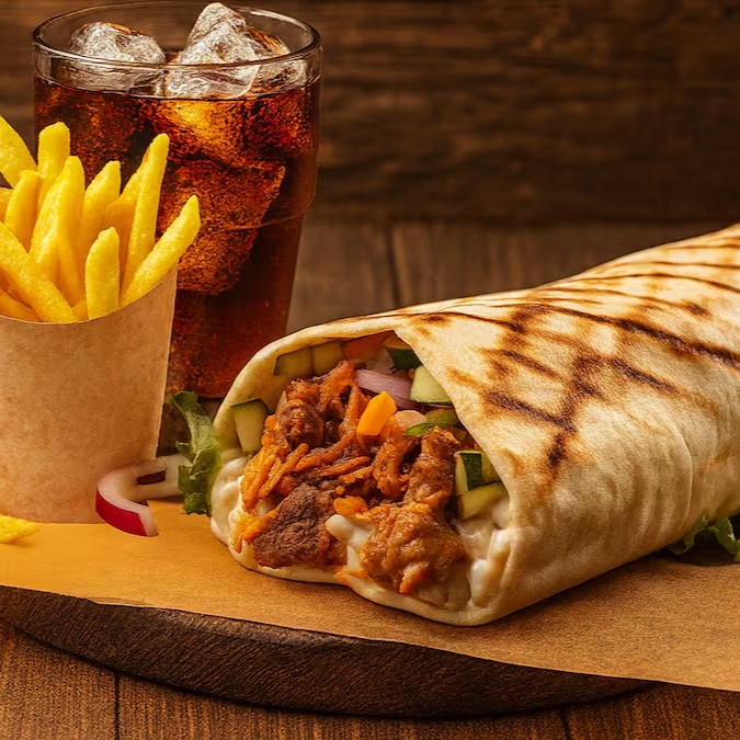 Autêntico shawarma de carne marinada no pão sírio, servido com fritas crocantes, molho de alho cremoso à parte e Coca-Cola gelada 350ml.