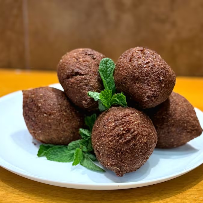 "Kibe artesanal feito com uma combinação perfeita de trigo, carne moída temperada e ervas frescas. Crocante por fora, suculento por dentro, uma explosão de sabores tradicionais que vai conquistar o seu paladar. Perfeito como lanche ou acompanhamento!"