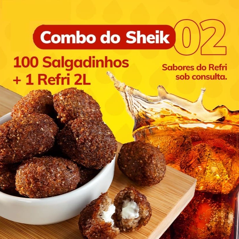 Desfrute de 50 deliciosos kibes de 15g cada, cuidadosamente recheados com carne moída suculenta ou com um cativante queijo com alho. Conhecidos por sua incrível explosão de sabor, estes kibes são considerados pelos nossos estimados clientes como os melhores da região. Acompanha, uma bebida à sua escolha, para complementar perfeitamente sua experiência culinária. Faça parte dos apreciadores do 'Especial do Sheik'.