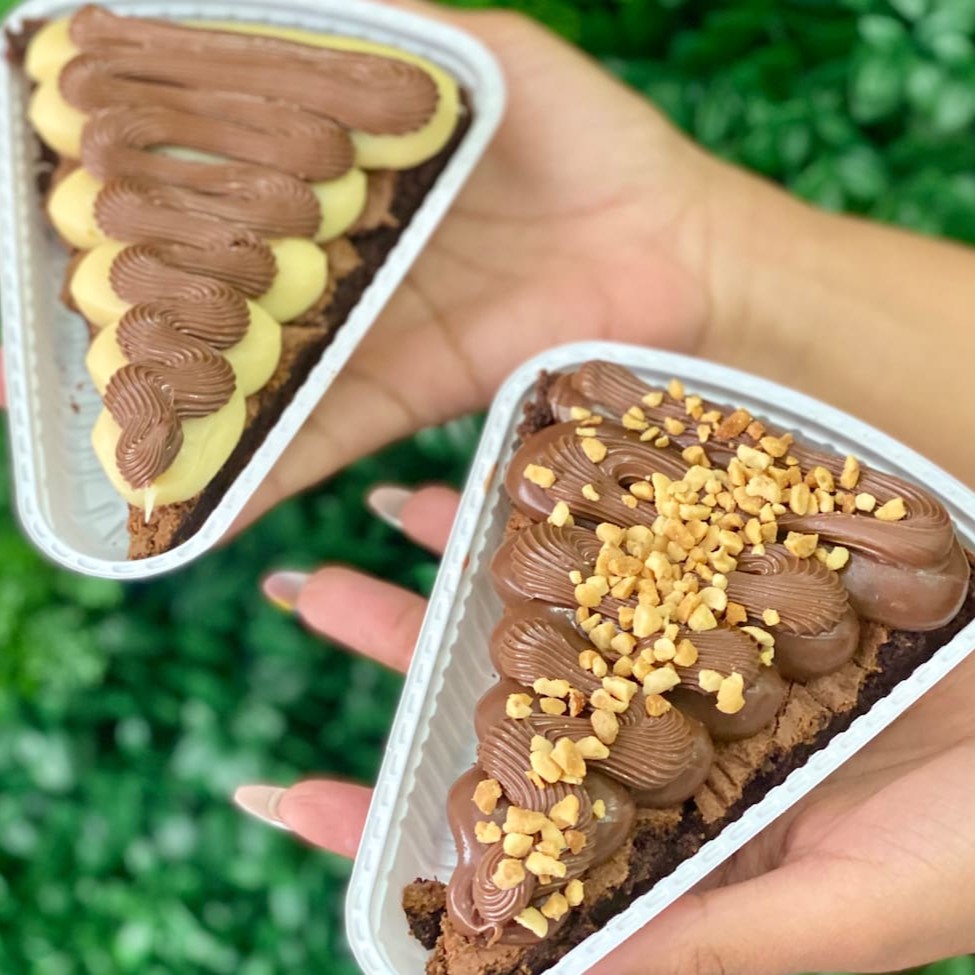 Nosso brownie no formato de pizza é incrivelmente cremoso por dentro, com uma casquinha crocante por fora. Ele é coberto com brigadeiro de Ninho e finalizado com Nutella.
