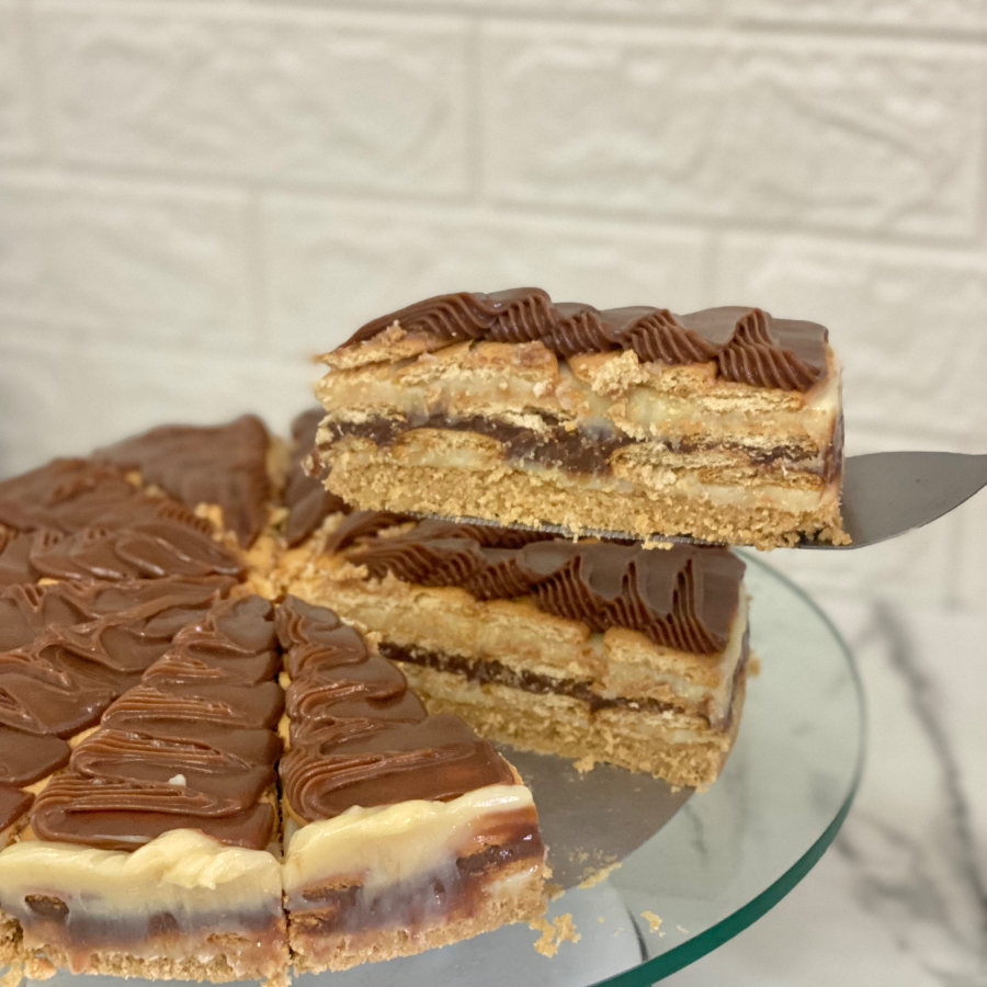 Torta Duo de Palha Italiana Camadas de brigadeiro e creme de leite Ninho sobre base crocante de palha italiana, finalizada com cobertura de chocolate.