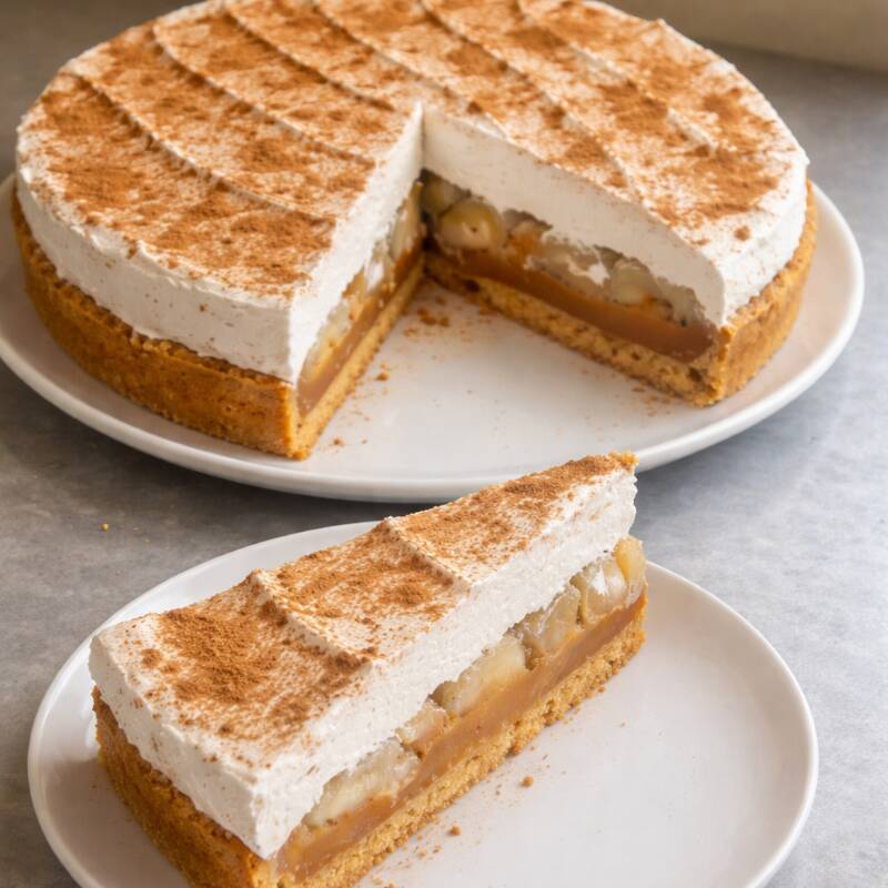 Base de biscoito, doce de leite caseiro, banana e finalizada com chantilly e canela polvilhada.
