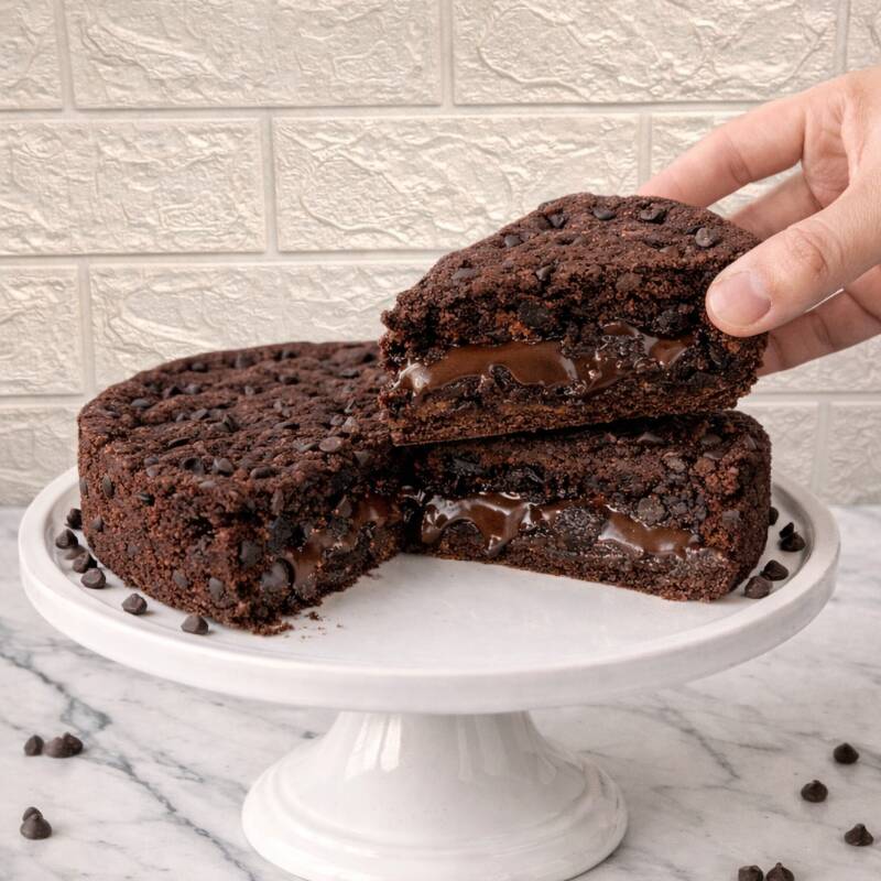 Cookie sabor chocolate 50%, recheado com pedaços de brownie e brigadeiro.