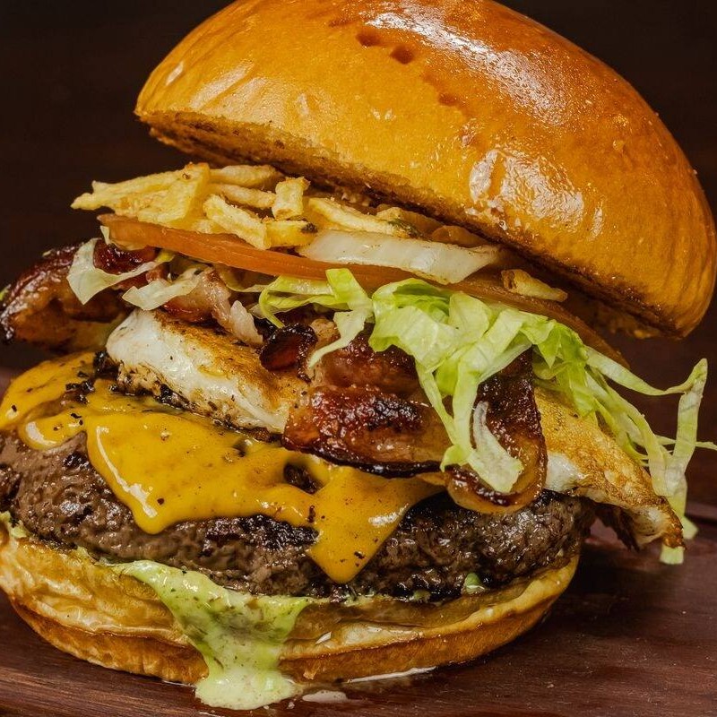 Pão Brioche, Carne Angus 160gr, Queijo Cheddar, Ovo, Bacon, Batata Palha, Salada Fresca e maionese verde