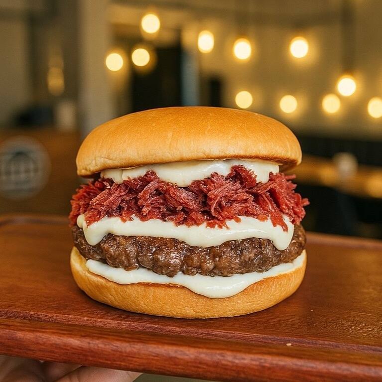 Pão brioche, Carne Angus 160gr, Cream Cheese, Carne Seca Desfiada e Maionese da Casa