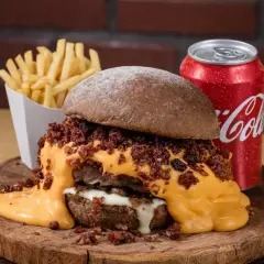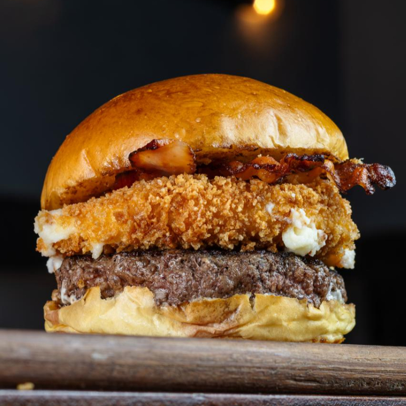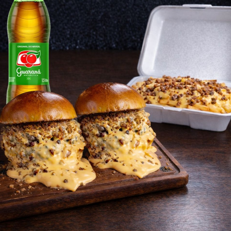 Pão de brioche, Blend Angus 160, Disco de Catupiry Empanado na Farinha Especial, Bacon em Fatias e Maionese Silver.